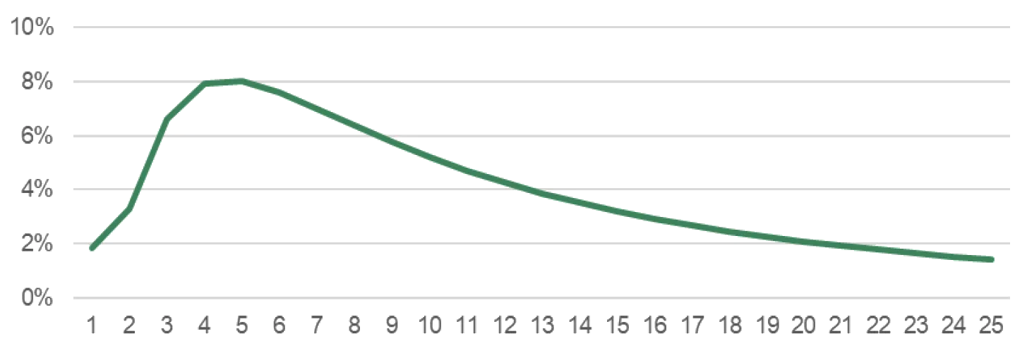 The carbon yield curve in Figure 1 below shows the first few years of modelled growth are modest but by years 4 and 5 you can expect peak annual yields, trailing off over for the remainder of the crediting term. This means that 60% of your carbon credits will usually be issued within the first 10-year period.